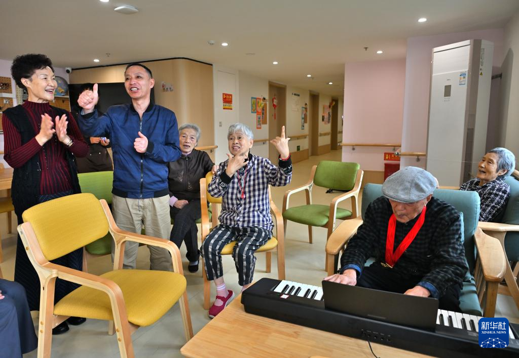 10月9日,在爱恩康养服务中心,老人们自弹自唱歌曲。
