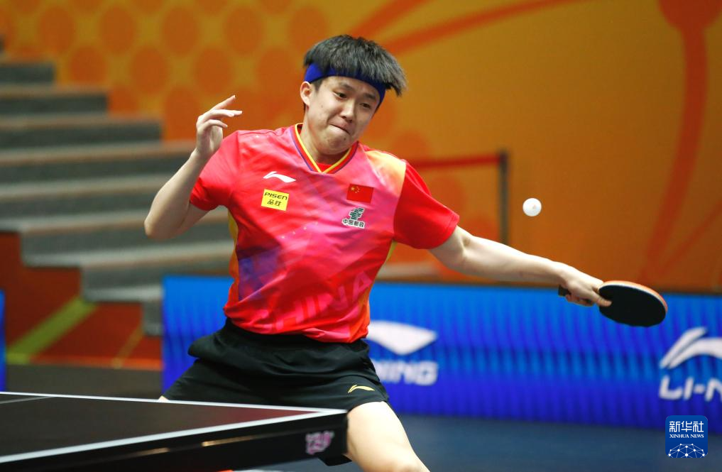 10月10日,中国队选手林诗栋在比赛中回球。最终,他3比1战胜中国台北队选手林昀儒。新华社发(奥斯帕诺夫摄)