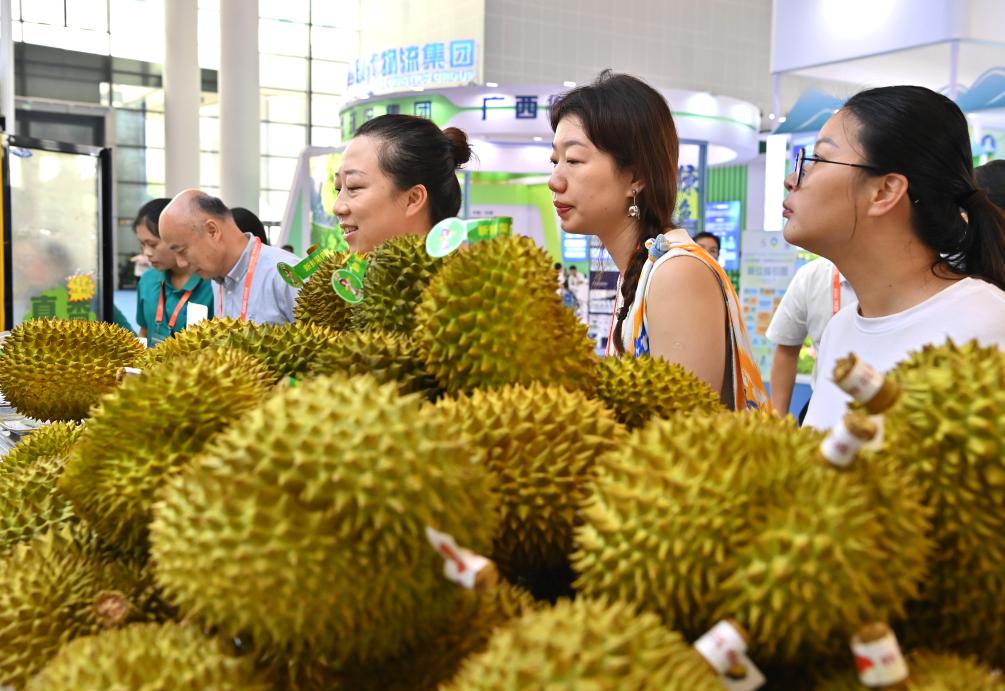 9月28日,观众在第21届中国—东盟博览会上挑选马来西亚榴莲。新华社记者周华摄
