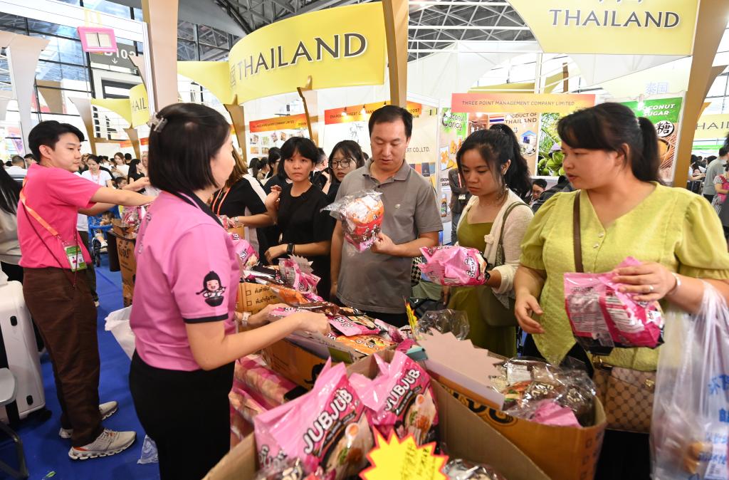 9月28日,在广西南宁国际会展中心,消费者在选购来自泰国的商品。在广西南宁举行的第21届中国—东盟博览会上,东盟国家的榴莲、红木、饼干、咖啡和俄罗斯牛筋肠、秘鲁羊驼毛公仔等产品“走红”,深受观众喜爱。新华社记者陆波岸摄