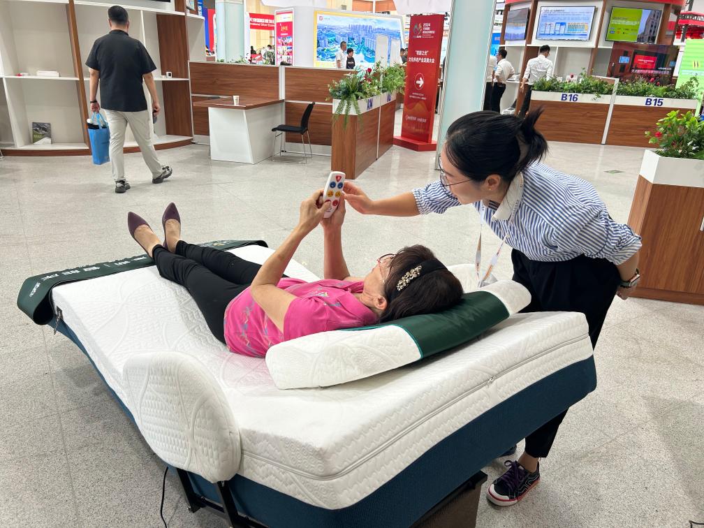 在2024天津国际银发经济博览会上,观众在体验适老功能床垫。新华社记者 尹思源 摄