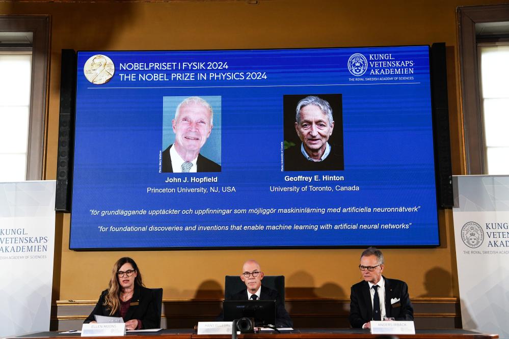 2024年10月8日,在瑞典斯德哥尔摩举行的2024年诺贝尔物理学奖公布现场,屏幕显示奖项得主美国普林斯顿大学的约翰·霍普菲尔德和加拿大多伦多大学的杰弗里·欣顿。新华社记者 彭子洋 摄