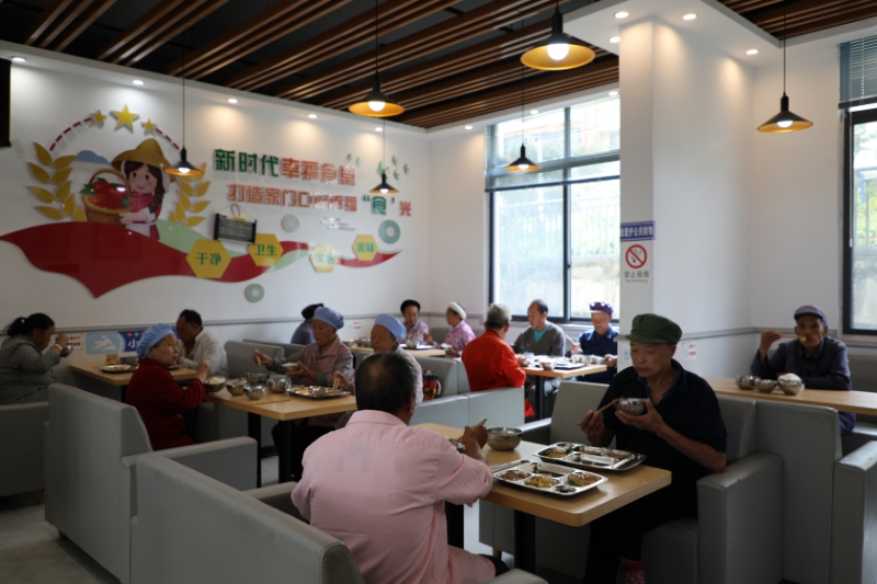 老人们在云南省昭通市永善县溪洛渡街道红光社区幸福餐厅用餐。(杨亚莉 摄)