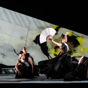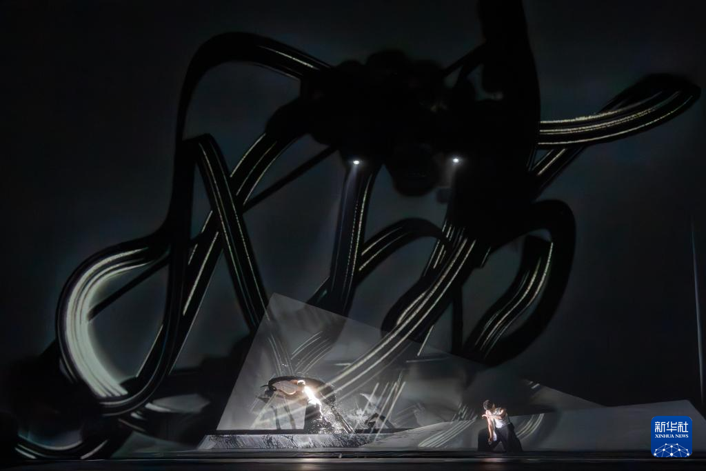 香港舞蹈团《快雪时晴》在舞台设计上加入水墨元素,舞者与之互动会留下书法般的痕迹(10月11日摄)。 新华社发(香港舞蹈团供图)
