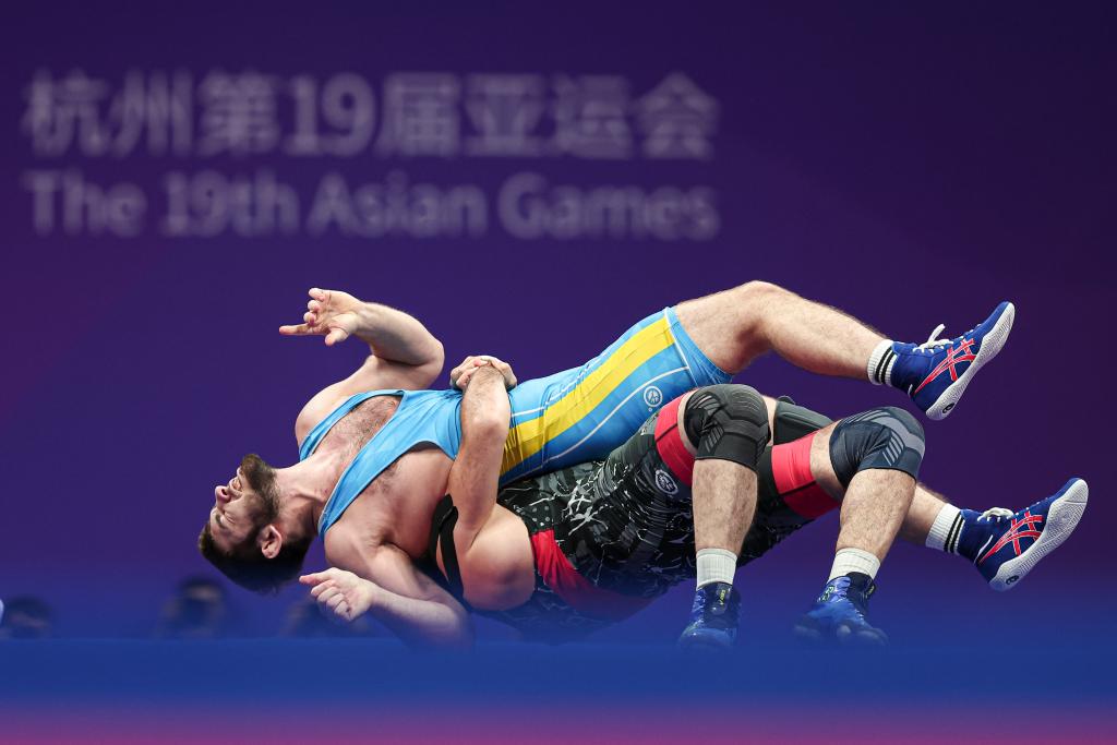 2023年10月5日,乌兹别克斯坦选手鲁斯塔姆·阿萨卡洛夫(下)在杭州亚运会男子古典式摔跤97公斤级铜牌决赛中对阵哈萨克斯坦选手伊斯兰·乌马耶夫。新华社记者 吴壮 摄