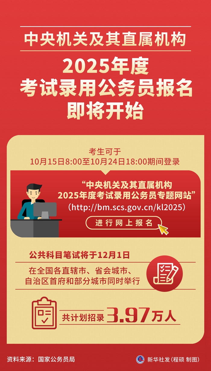 新华社北京10月14日电 记者14日从国家公务员局获悉,中央机关及其直属机构2025年度考试录用公务员报名即将开始,共计划招录3.97万人。考生可于10月15日8:00至10月24日18:00期间登录“中央机关及其直属机构2025年度考试录用公务员专题网站”(http://bm.scs.gov.cn/kl2025)进行网上报名,公共科目笔试将于12月1日在全国各直辖市、省会城市、自治区首府和部分城市同时举行。