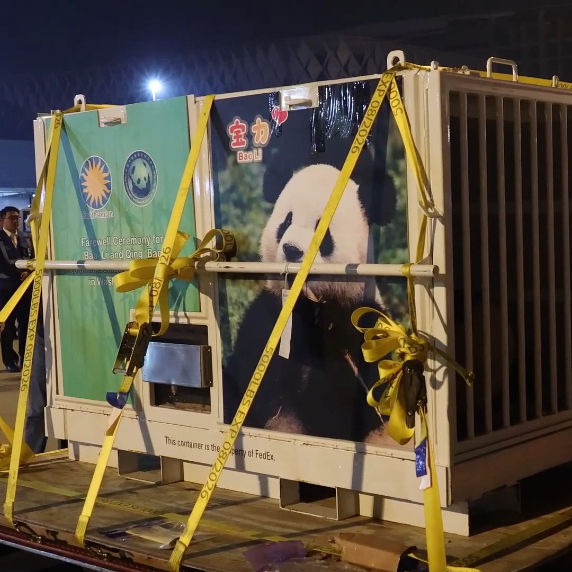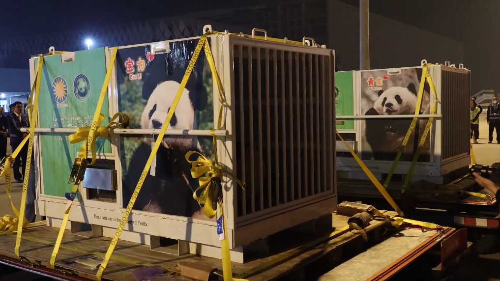 14日晚,大熊猫“宝力”“青宝”乘坐专车离开中国大熊猫保护研究中心都江堰基地前往成都双流国际机场,于15日搭乘专机前往美国华盛顿国家动物园,开启为期10年的旅居生活。