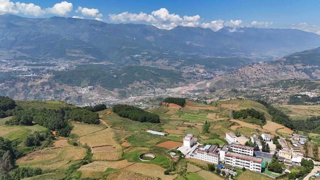 这是从四川省普格县花山镇东山小学(右下角,原东山乡中心学校),左侧半山腰依稀可见普格县城(9月20日摄,无人机照片)。