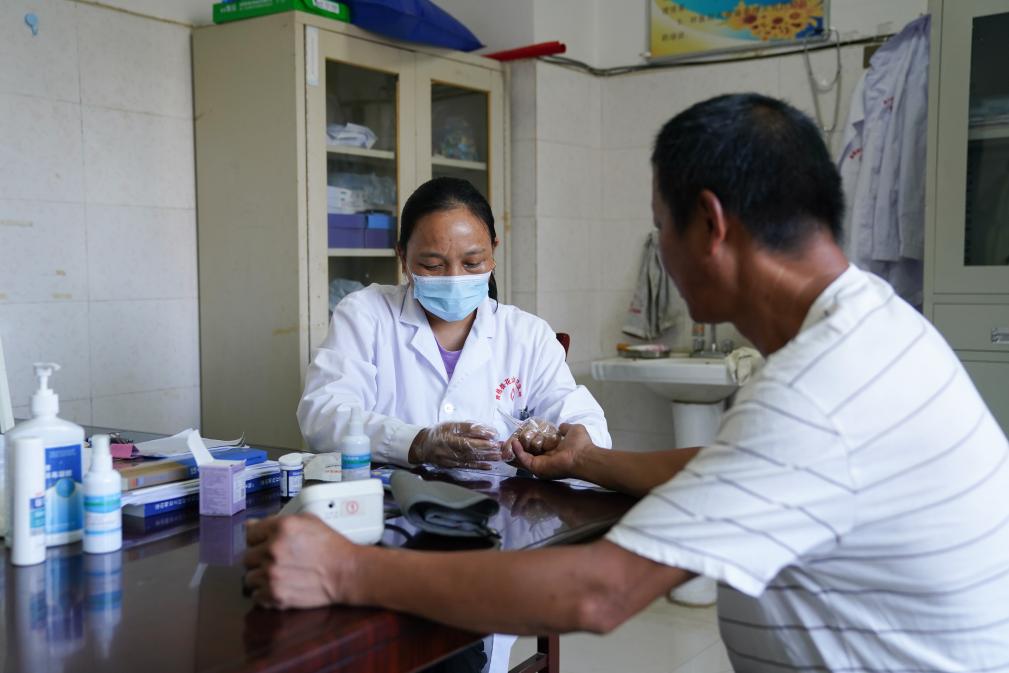 9月20日,四川省普格县花山镇卫生院,乃古莫子作(左)为病人测血糖。