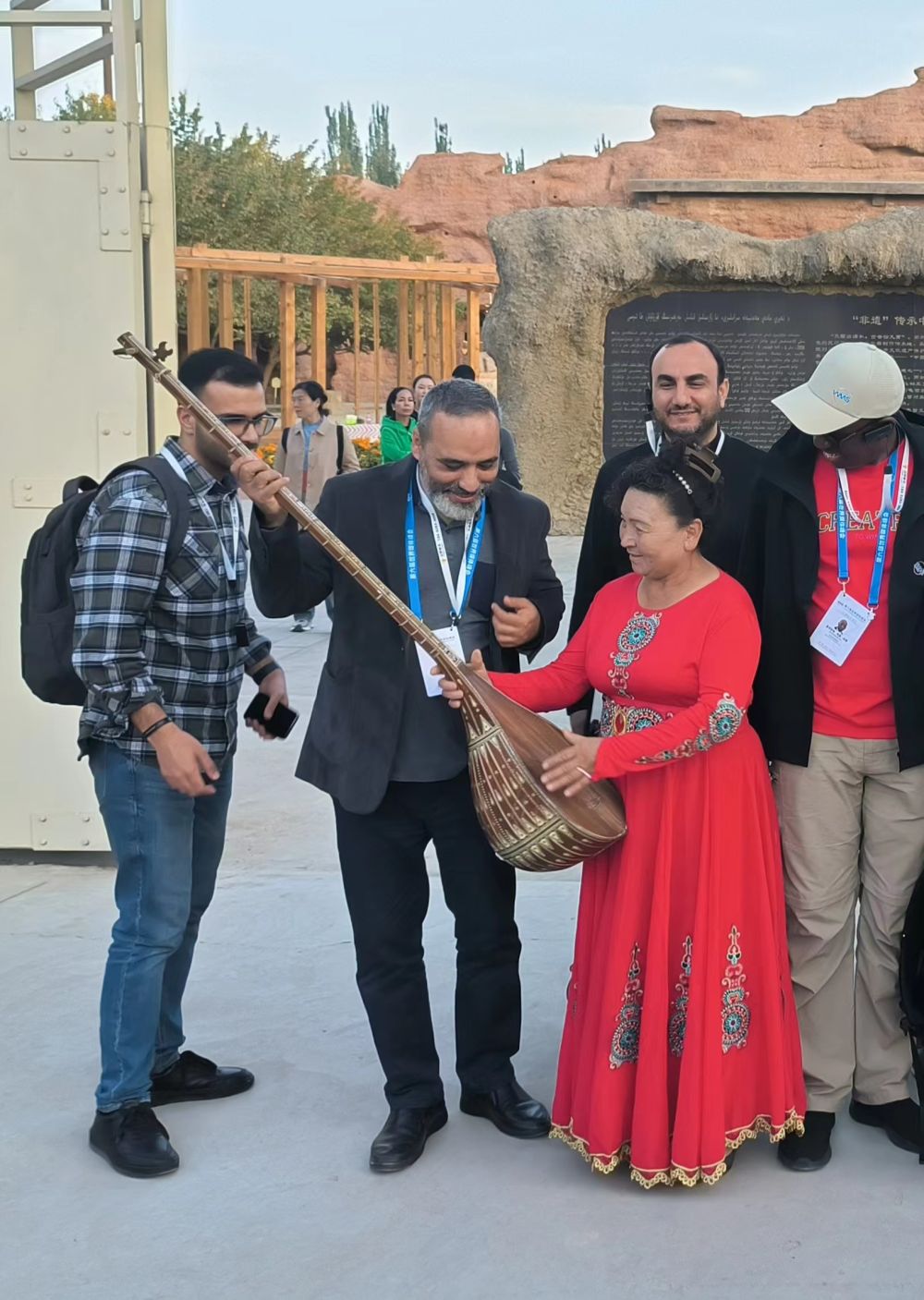 在看到新疆地区流行的都塔尔琴等多种乐器都和伊朗的乐器很相似后,拉赫马提更是情不自禁地“客串”讲解员,给一道参观的媒体同行讲解起乐器的演奏方法。拉赫马提说,文明的交融与共鸣使他很享受这次参观。