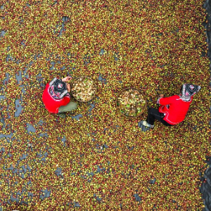 10月15日,村民在龙里县颐光山林油茶生态园晾晒油茶果(无人机照片)。