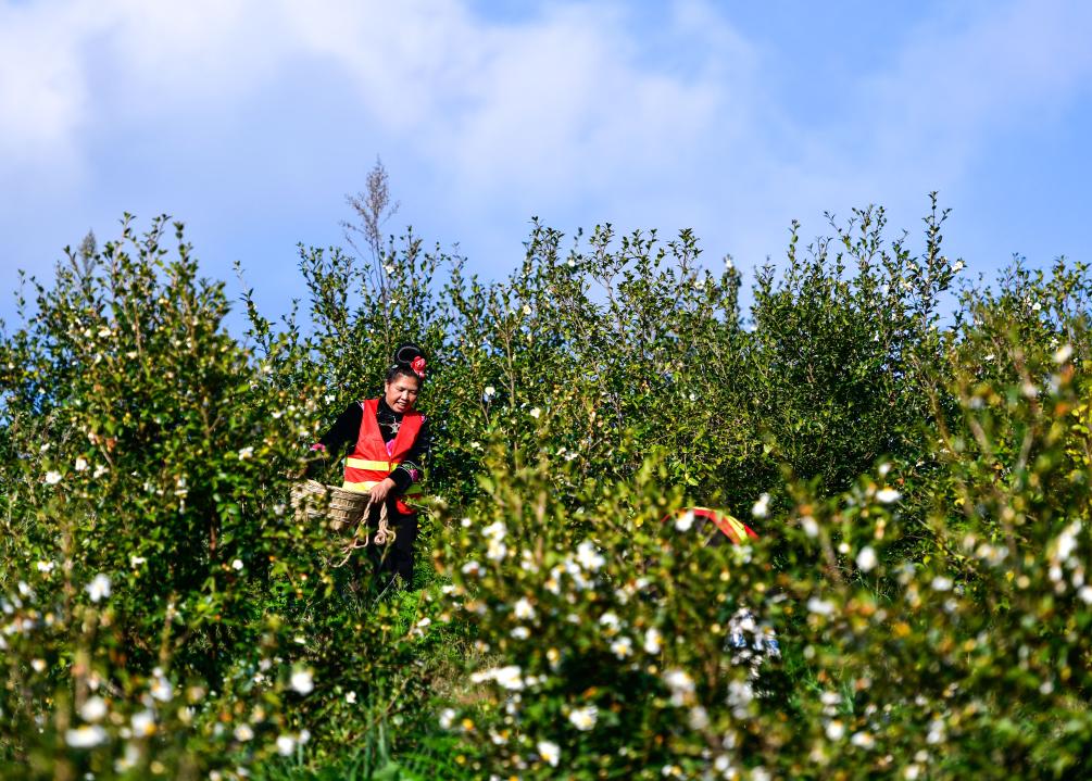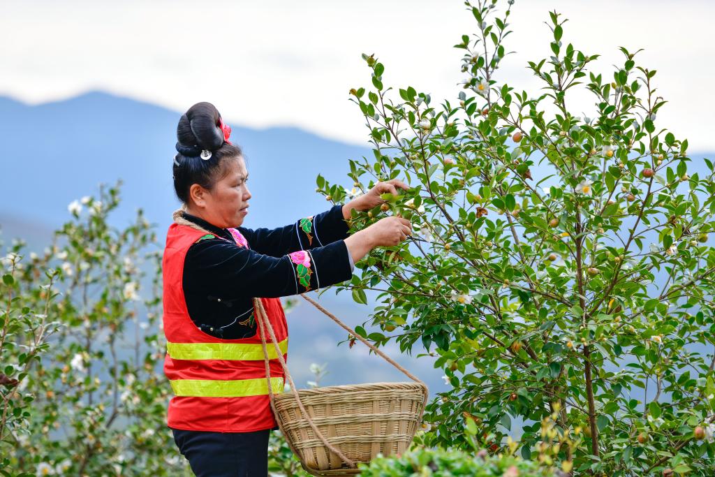 10月15日,村民在龙里县颐光山林油茶生态园采摘油茶果。