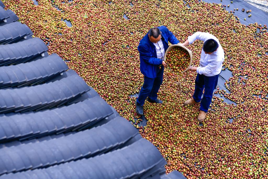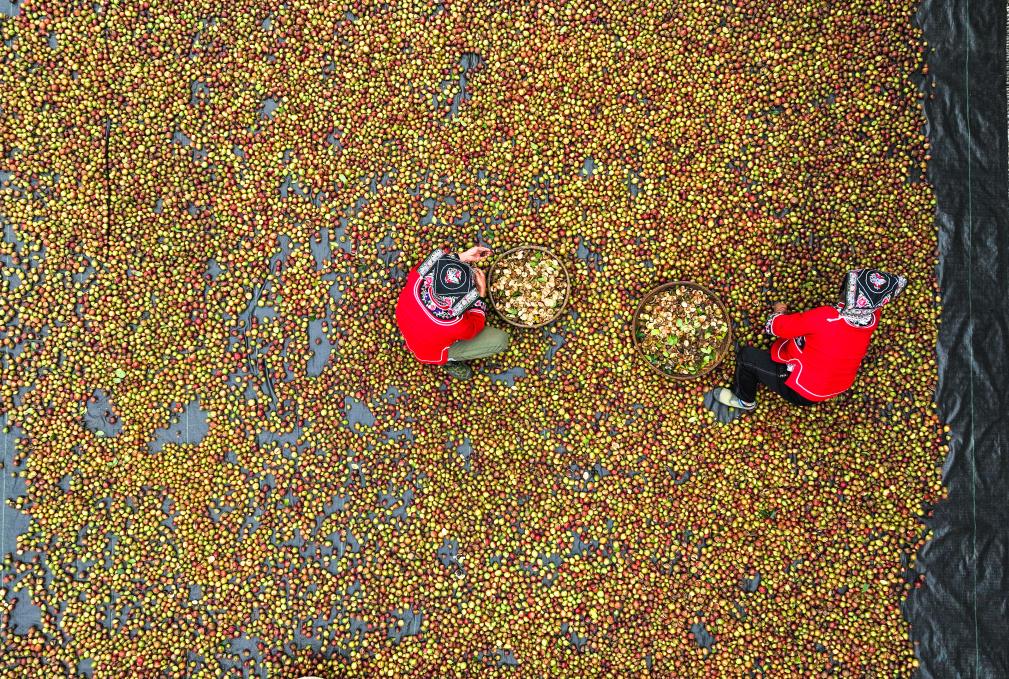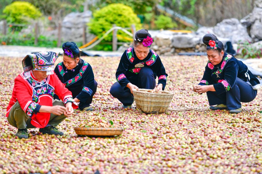10月15日,村民在龙里县颐光山林油茶生态园晾晒油茶果。