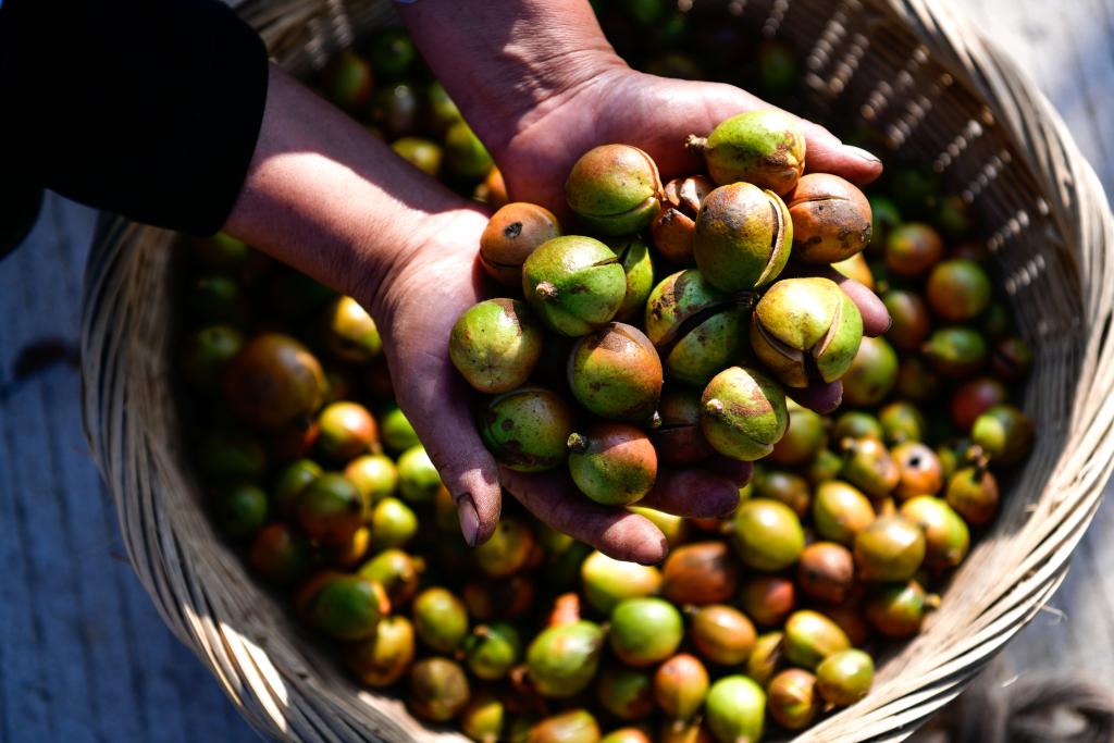 10月15日,村民在龙里县颐光山林油茶生态园展示新采摘的油茶果。