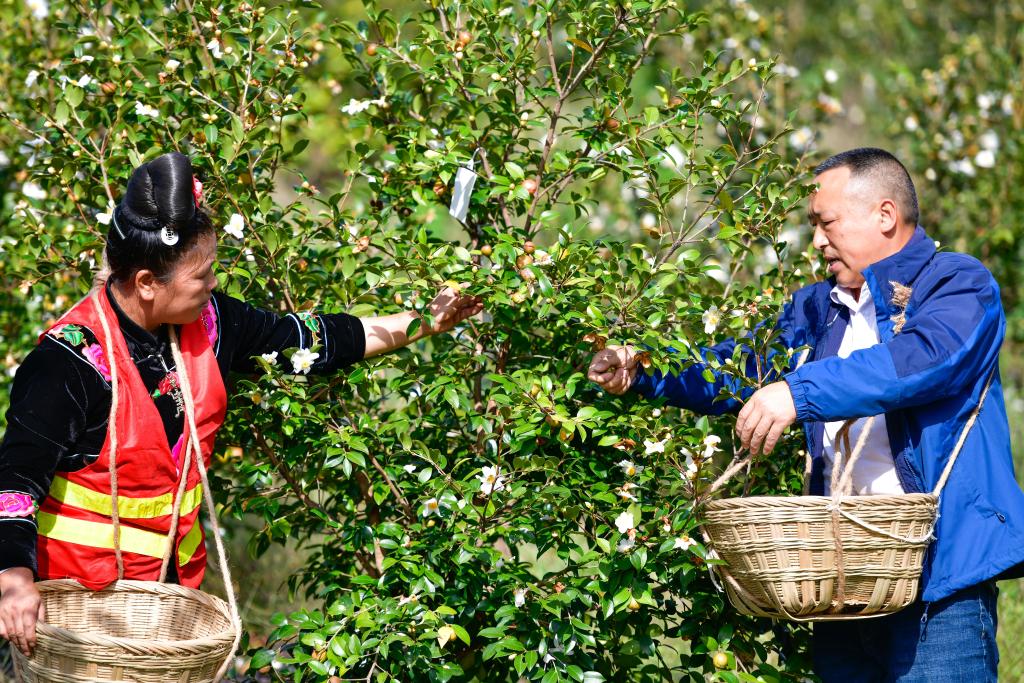 10月15日,工人(右)和村民在龙里县颐光山林油茶生态园采摘油茶果。