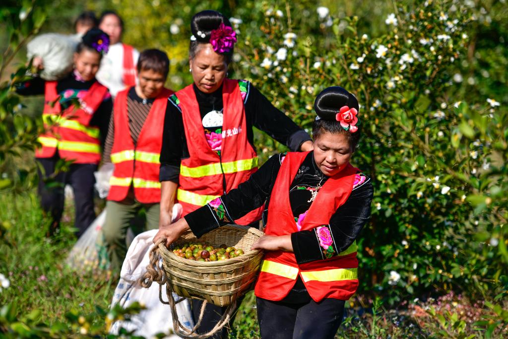 10月15日,村民在龙里县颐光山林油茶生态园搬运油茶果。