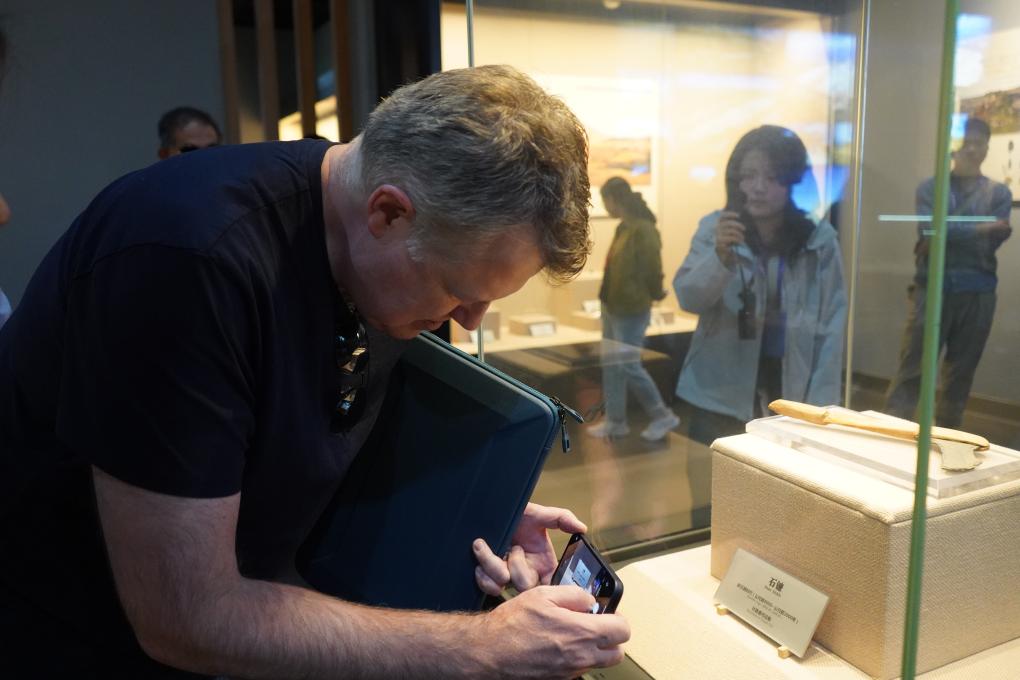 10月15日,巴西《圣保罗页报》首席商务官马塞洛·索萨·利马·贝内斯在新疆吐鲁番博物馆用手机拍摄展品。新华社记者 朱艺琳 摄