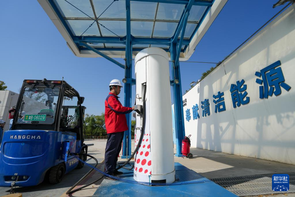 10月15日,在中国石化燕山石化公司的加氢站,一名工作人员在为一辆氢能叉车加氢气。新华社记者 鞠焕宗 摄