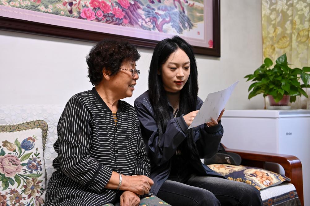 9月27日,在位于晋中市太谷区太纺社区的家里,张改英(左)和外孙女武炎雯一边翻看老照片,一边回忆往事。