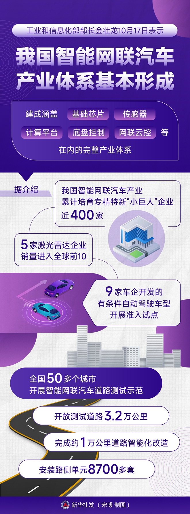 新华社北京10月17日电(记者张晓洁、胡旭)工业和信息化部部长金壮龙17日表示,我国智能网联汽车产业体系基本形成,建成涵盖基础芯片、传感器、计算平台、底盘控制、网联云控等在内的完整产业体系,人机交互等技术全球领先,线控转向、主动悬架等技术加快突破。