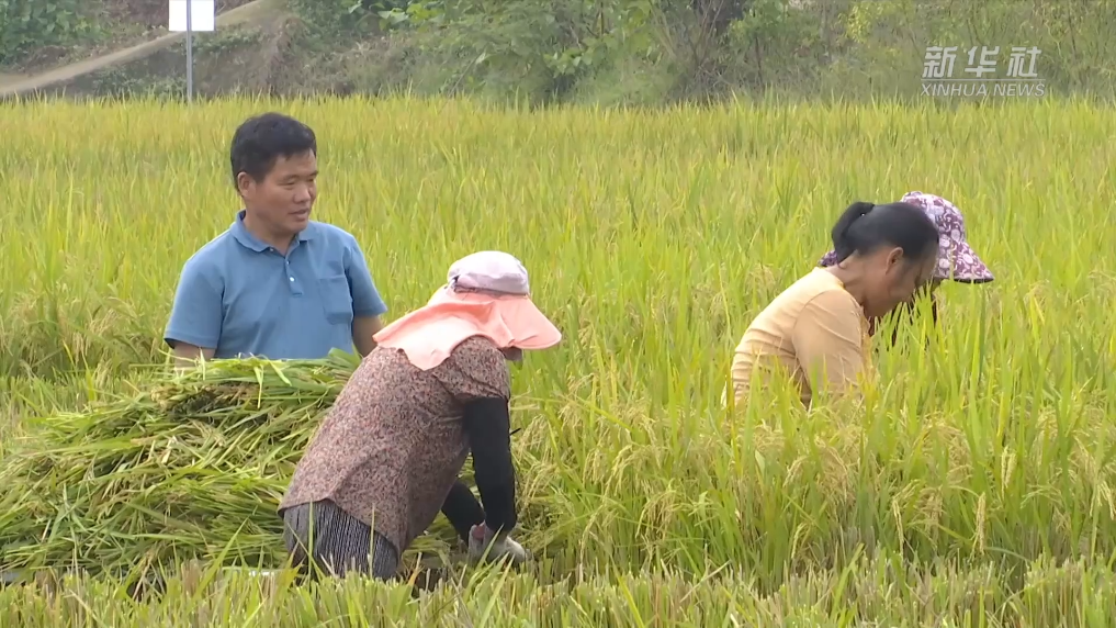 金秋时节,在位于泸州市泸县潮河镇五谷寺村的中稻+再生稻“吨粮田”示范区,当地百姓趁着晴好天气抓紧收割。