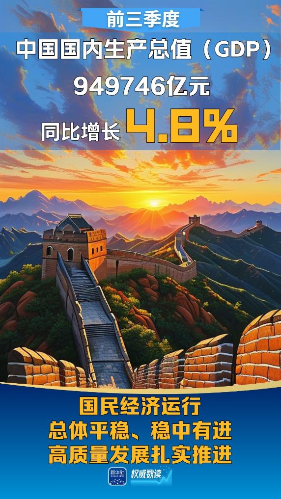 国家统计局10月18日发布显示,初步核算,前三季度国内生产总值949746亿元,按不变价格计算,同比增长4.8%。总的来看,前三季度经济运行总体平稳、稳中有进,政策效应不断显现,主要经济指标近期出现积极变化。