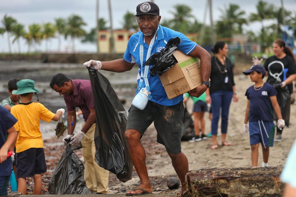 2023年6月7日,师生在斐济首都苏瓦清理海滩垃圾。新华社发(桑钦龙摄)