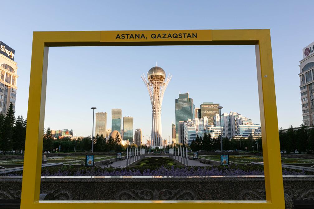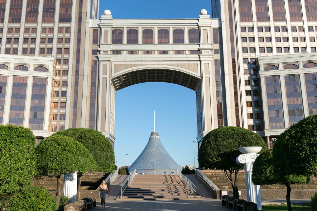 6月29日拍摄的哈萨克斯坦首都阿斯塔纳的城市中轴线景观,远处的建筑是“可汗之帐”购物中心。新华社记者 白雪骐 摄