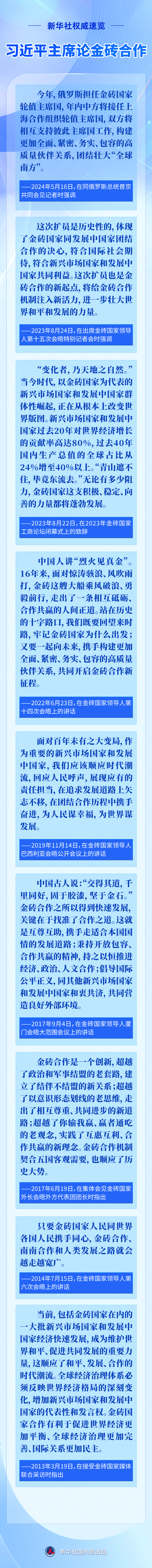 应俄罗斯联邦总统普京邀请,国家主席习近平将于10月22日至24日赴俄罗斯喀山出席金砖国家领导人第十六次会晤。今年是“大金砖合作”开局之年,此次会晤是金砖扩员后首次举行,国际社会广泛关注。近年来,习近平主席围绕金砖合作作出一系列重要论述,一起重温——
