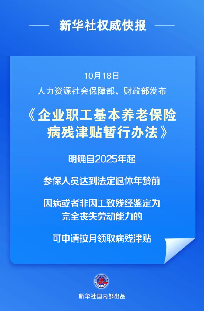 10月18日,人力资源社会保障部、财政部发布《企业职工基本养老保险病残津贴暂行办法》。