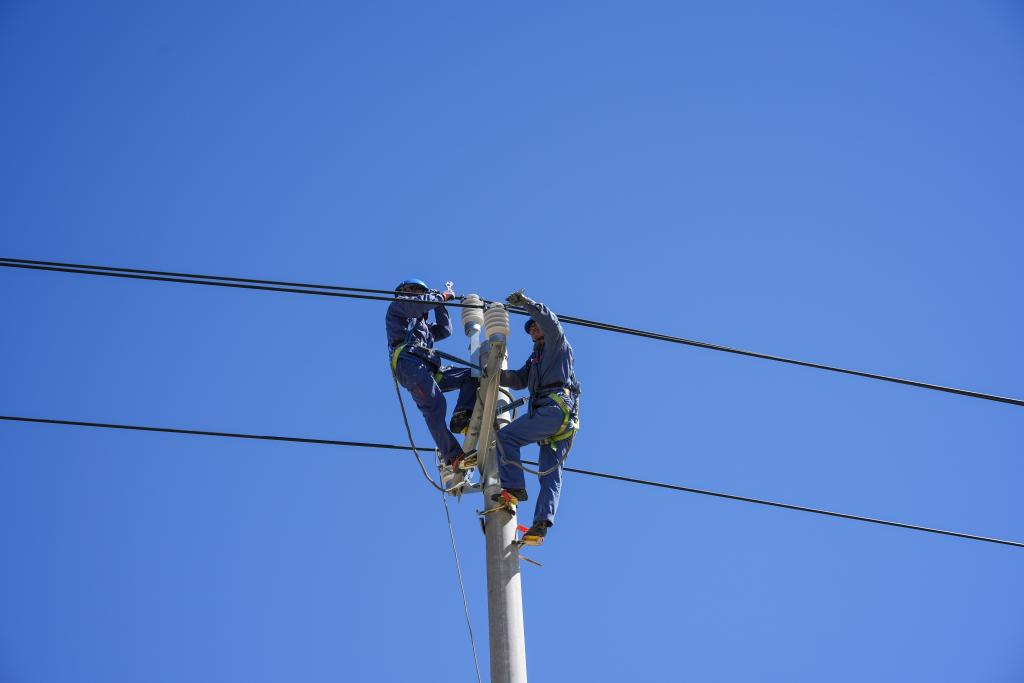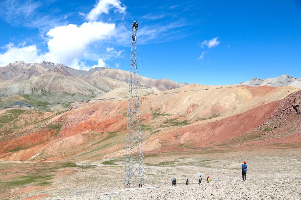 9月6日,国网青海省电力公司输电专业施工人员架设安装苏里乡10千伏线路。(徐琛 摄)