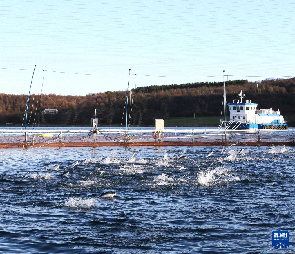 这张2023年10月10日拍摄的资料照片显示的是位于挪威北部特罗姆斯郡峡湾中的三文鱼养殖网箱。新华社记者 张玉亮 摄