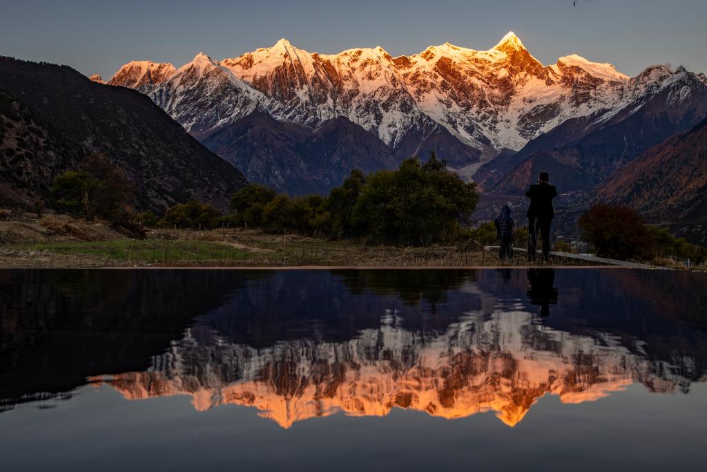 2023年11月13日,游客在索松村拍摄日落时分的南迦巴瓦峰。新华社记者 姜帆 摄