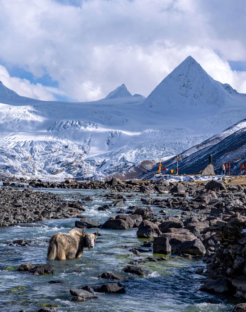 2023年10月28日,一头牦牛站在萨普雪山脚下的河流里。新华社记者 孙非 摄