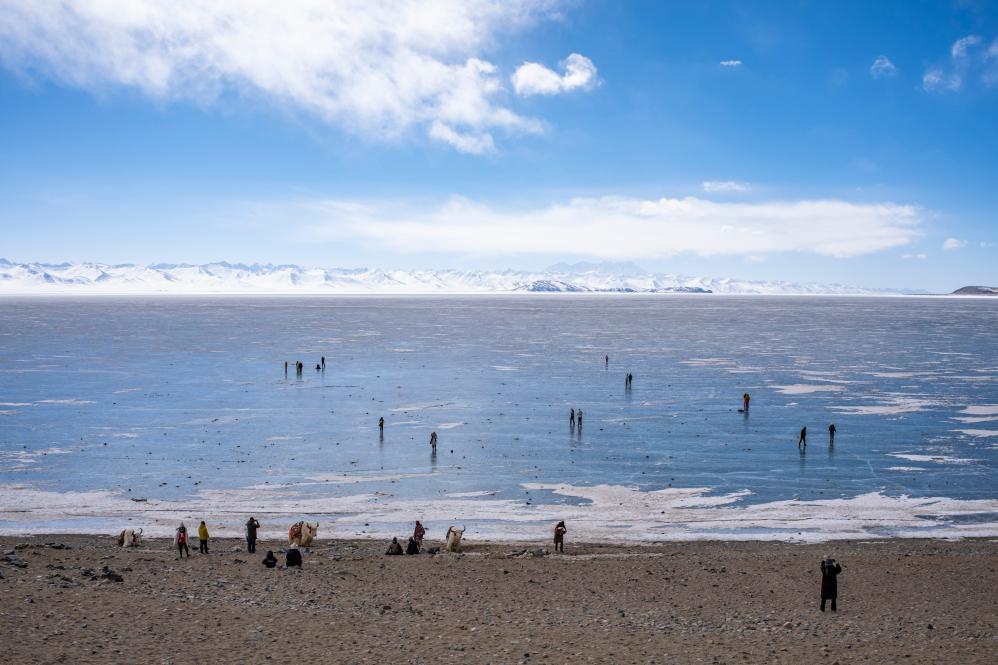 2024年2月8日,游客在结冰的纳木错湖面上游玩。新华社记者 孙非 摄