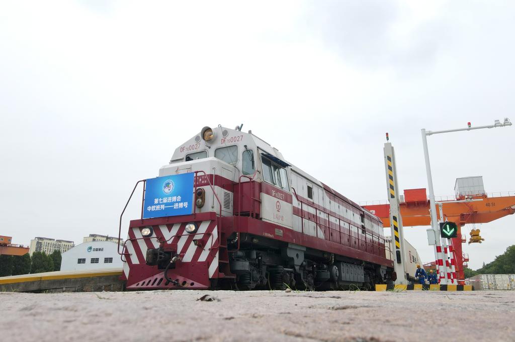 10月20日,满载第七届进博会展品的“中欧班列—进博号”列车驶入上海铁路物流中心闵行货场中储专用线。新华社记者 方喆 摄