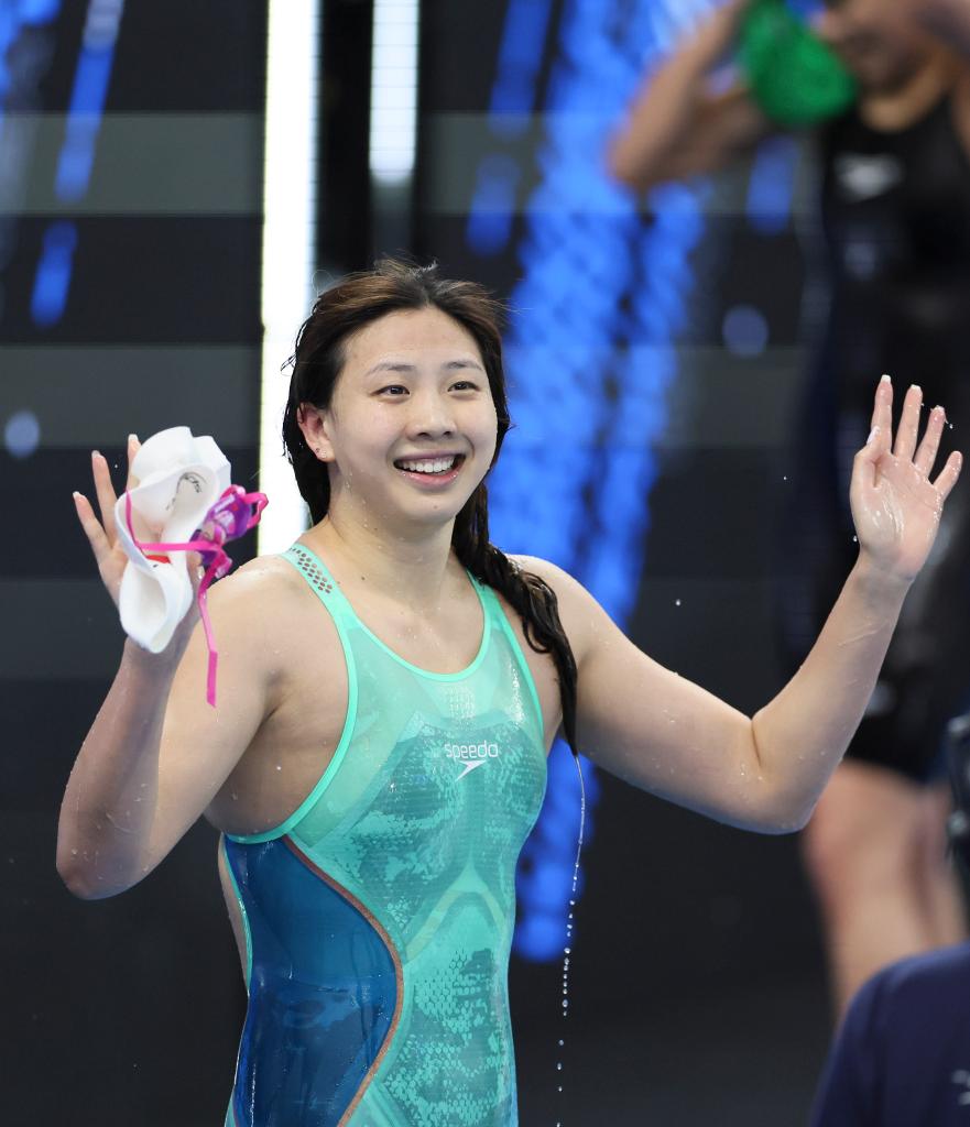 10月19日,唐钱婷夺冠后向观众挥手致意。当日,在2024世界泳联游泳世界杯(上海站)女子100米蛙泳决赛中,中国选手唐钱婷获得冠军。新华社记者 王翔 摄