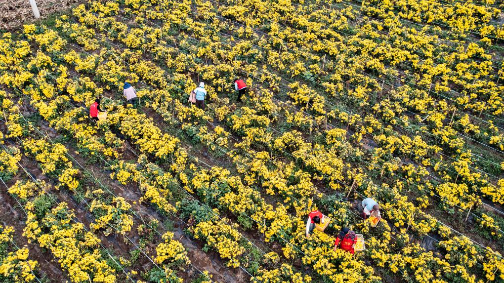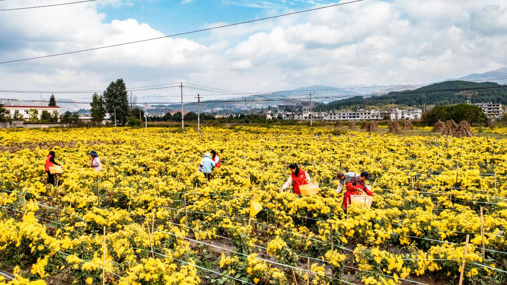 当地村民和党员志愿者在六盘水市钟山区大湾镇菊花种植基地采摘金凤菊(无人机照片,10月19日摄)。