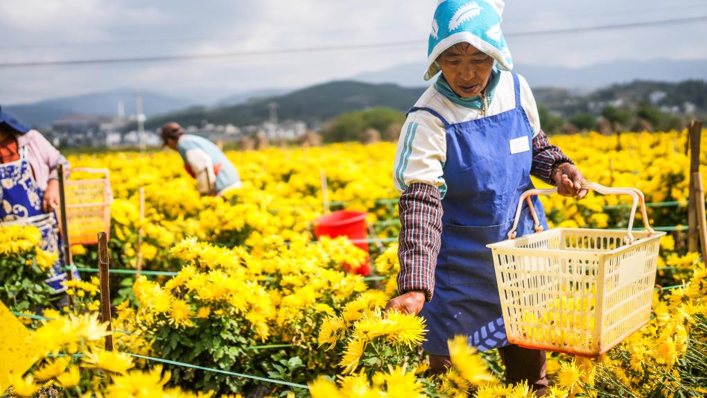 当地村民在六盘水市钟山区大湾镇菊花种植基地采摘金凤菊(10月19日摄)。