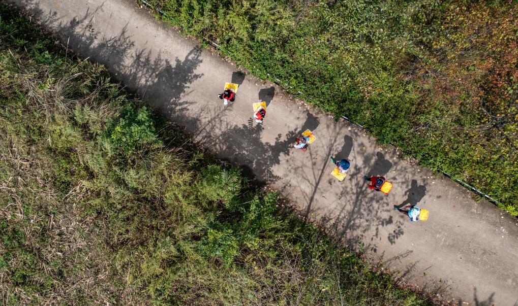 当地村民和党员志愿者将采收好的金凤菊带回工厂加工(无人机照片,10月19日摄)。