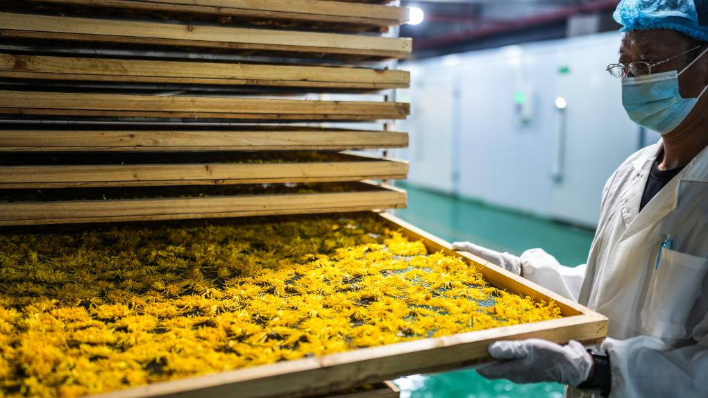 工作人员在加工车间内查看金凤菊烘干情况(10月19日摄)。