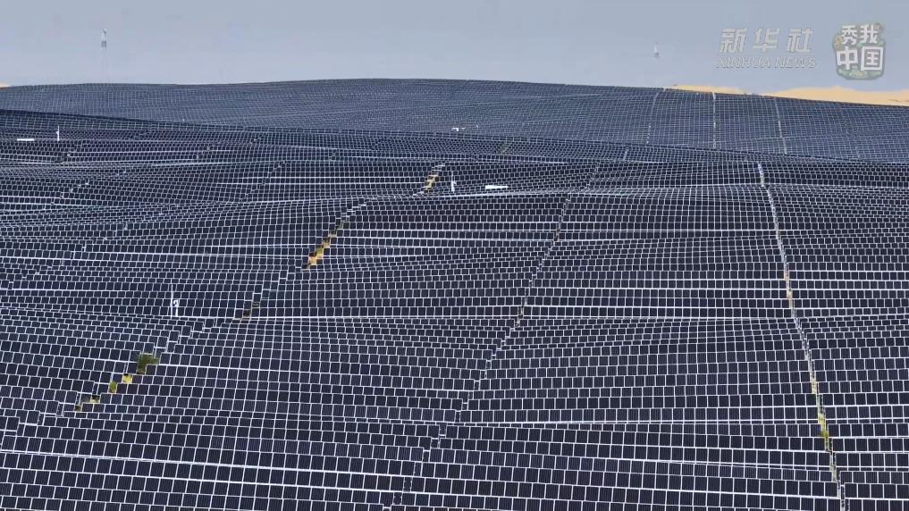 绿色的固沙植被、蓝色的光伏板、彩色的经济作物……你能看到几种颜色呢?