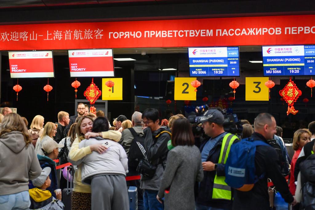 这是2024年9月28日拍摄的东航“上海-喀山”直飞首航航班抵达俄罗斯鞑靼斯坦共和国喀山国际机场。新华社记者曹阳摄