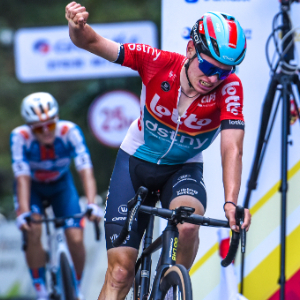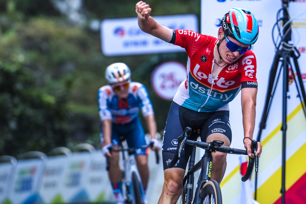 ↑10月19日,乐透车队车手莱纳特·范埃特维尔特(右)在冲线后庆祝。