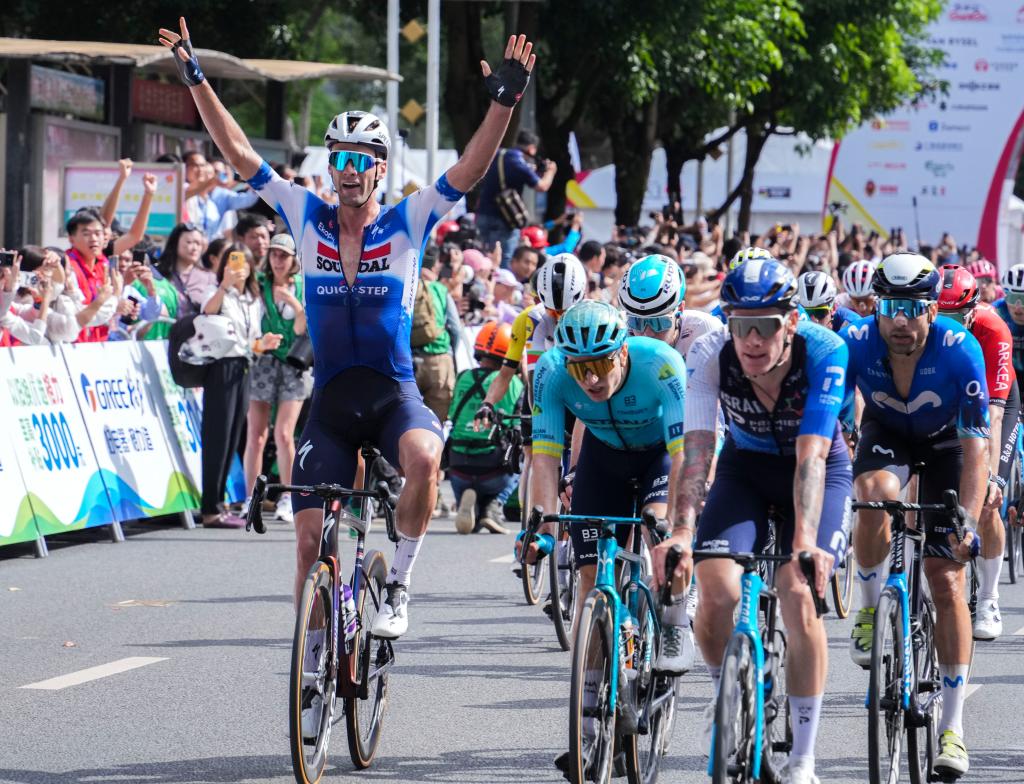 ↑10月16日,速的奥快步车队的比利时车手瓦尔·范格鲁威(左一)在冲线后庆祝。