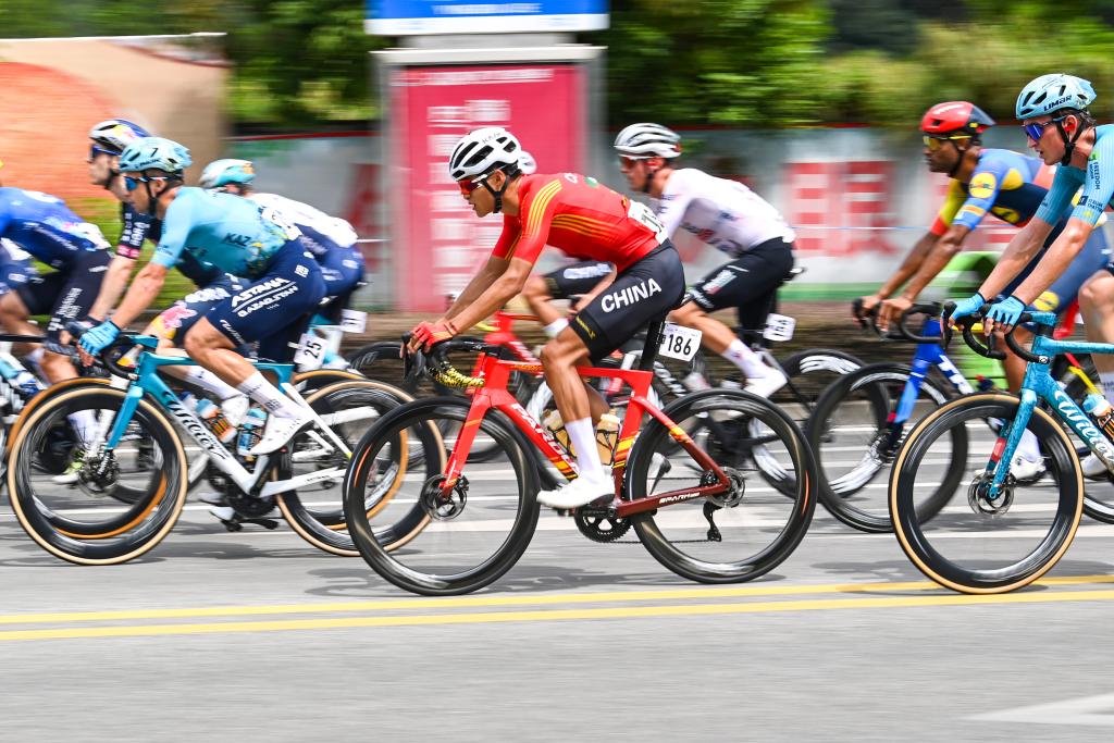 ↑10月15日,中国选手滕耕(中)在比赛中骑行。新华社记者 曹祎铭 摄