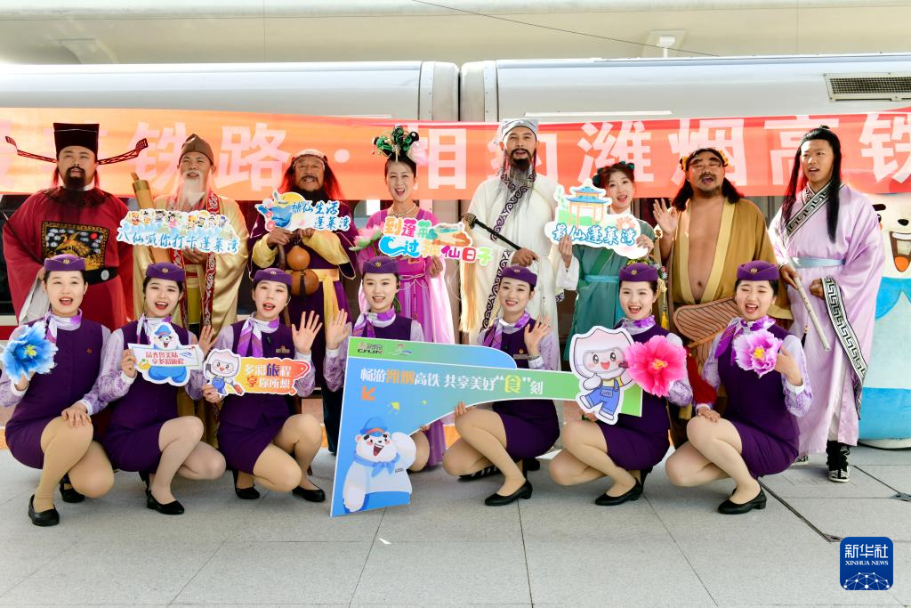 10月21日,在潍烟高铁莱州站,列车工作人员和烟台文旅部门组织的文艺工作者在复兴号G9227首发列车前合影留念。新华社记者 郭绪雷 摄