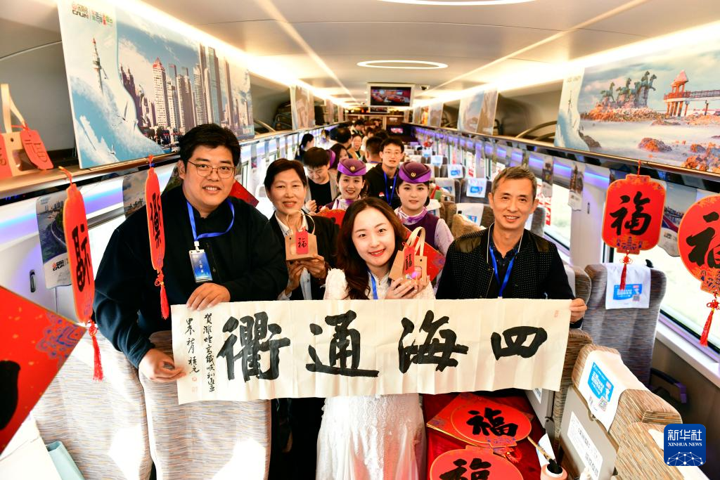 10月21日,在潍烟高铁复兴号G9227首发列车上,参与潍烟高铁开通运营仪式的工作人员合影留念。新华社记者 郭绪雷 摄