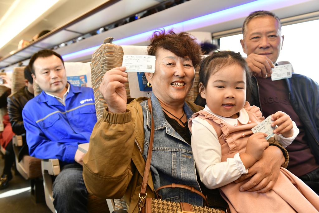 图为乘坐首发列车的乘客在展示自己的车票。新华社记者 郭绪雷 摄