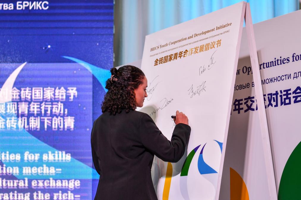 这是2024年9月25日在俄罗斯喀山拍摄的金砖国家青年代表在现场展板上签字。新华社记者 曹阳 摄